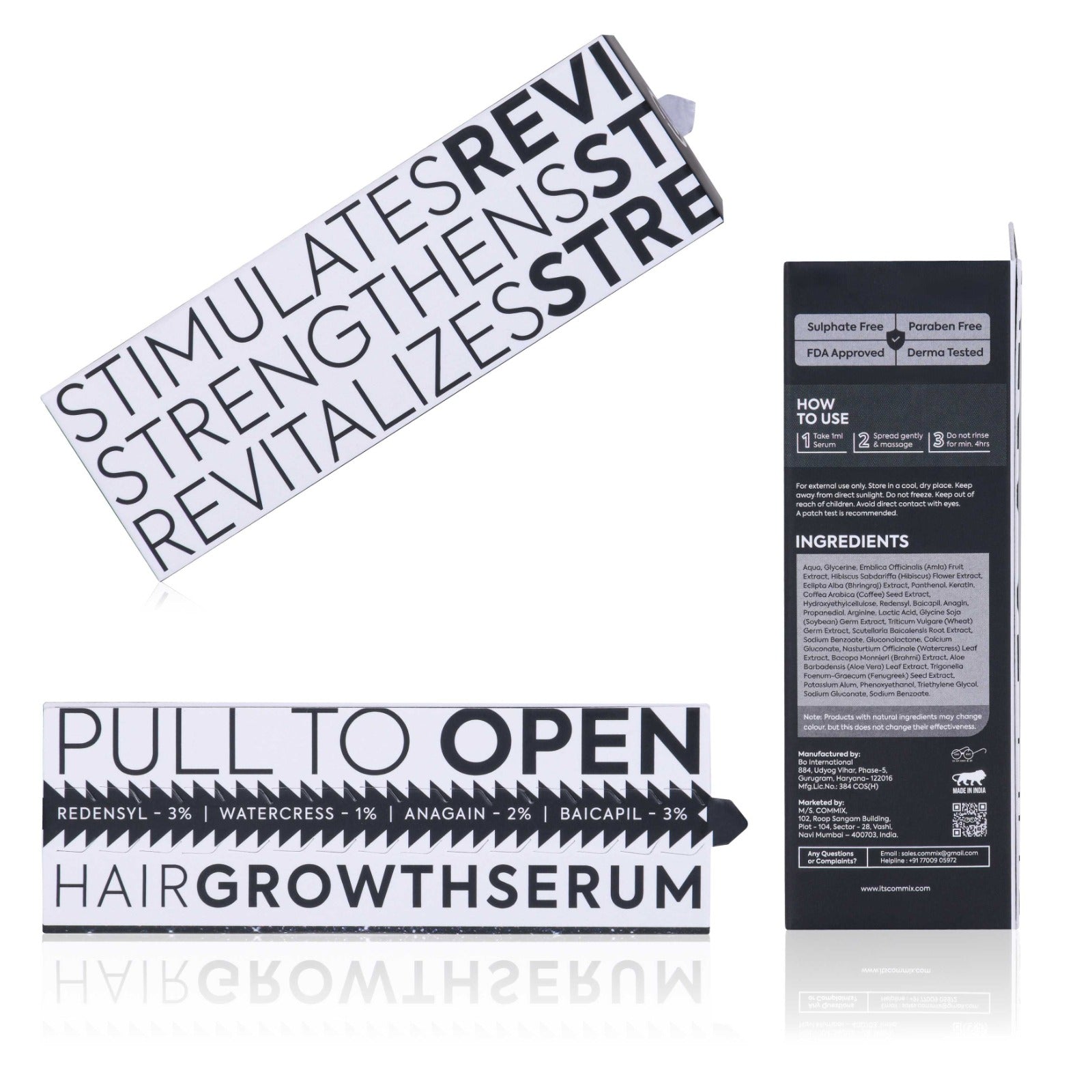 Commix Hair Regrowth Serum is a powerful blend of scientifically proven actives and botanical extracts that reduce hair fall and promote healthy regrowth. Infused with Redensyl, Baicapil, and Anagin, it revitalizes hair follicles, strengthens roots, and improves elasticity to reduce breakage and thinning. It nourishes hair, improves texture—making it smoother and healthier—while supporting a balanced scalp, helping control dandruff, and maintaining overall hair health with regular use. Suitable and safe for all, including dry, oily, and sensitive scalps.